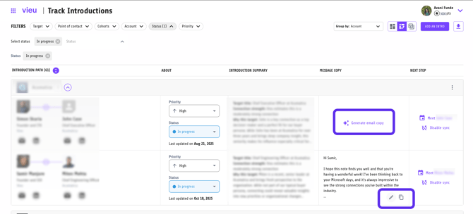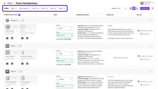 Introductions Vieu is where every pinned or requested introduction comes together. It gives you a single place to track progress, manage priorities, and move executive introductions forward without losing context.