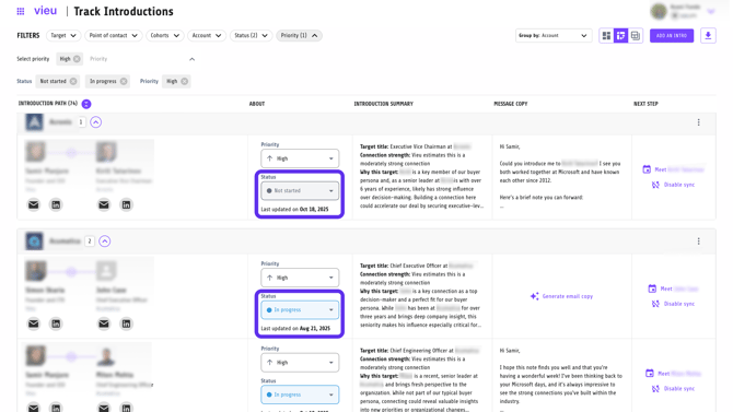 Introductions Vieu lets you track progress and urgency directly from the introductions list, so nothing gets lost as conversations move forward.